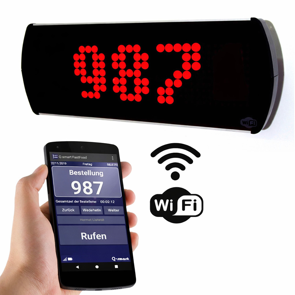 Das Q-smart WiFi Bestellwarteschlangen-Display, das speziell für Restaurants und Schnellrestaurants entwickelt wurde, ist sofort einsatzbereit, sobald es aus der Verpackung genommen wird. Schließen Sie den Adapter an, wählen Sie die Bestellwarteschlangen-Displays in der Terminalanwendung aus und genießen Sie das Warteschlangenmanagement-Erlebnis.